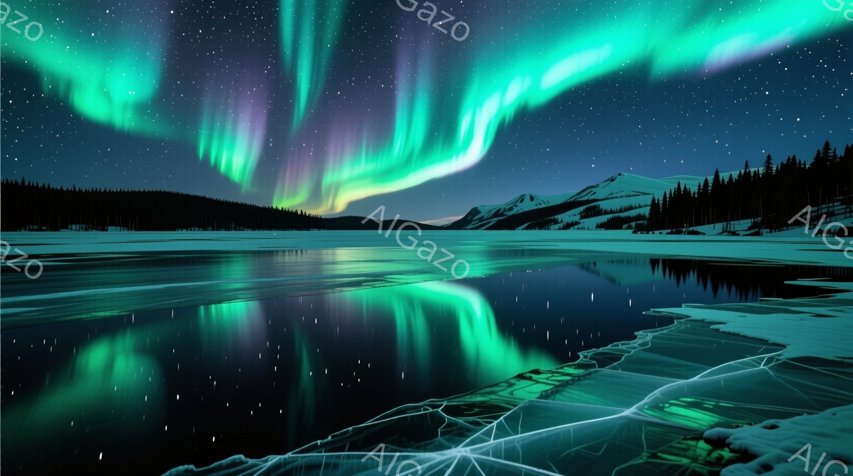 広大な凍てついた湖面が、オーロラの鮮やかな緑色の光を反射している。背後には暗いシルエットの針葉樹林が連なり、夜空には無数の星が輝いている。凍った湖の表面にはひび割れが走り、冷たく静寂な冬の夜の雰囲気を醸し出している。