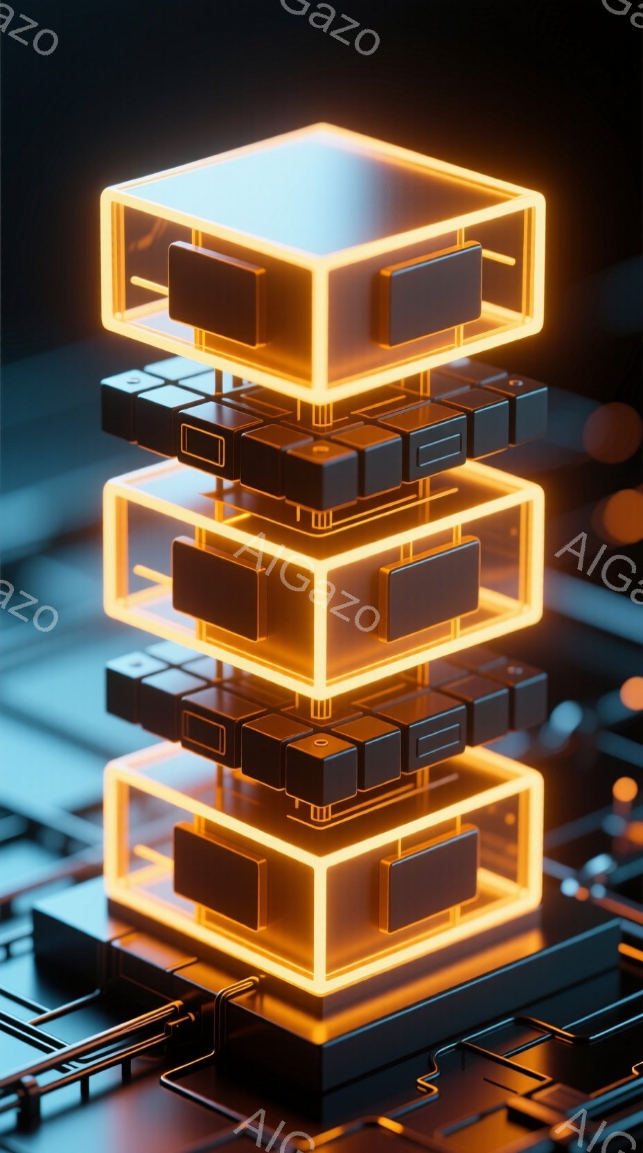 画像は、積み重ねられた3つの発光する立方体を描写しており、それぞれが複雑な回路パターンで縁取られています。 立方体は暗い、グリッド状の基盤の上に配置されており、未来的なテクノロジーや電子機器を連想させる雰囲気です。 全体的に、鮮やかなオレンジ色の光が、暗くメタリックな背景と対照的に、目を引く視覚効果を生み出しています。