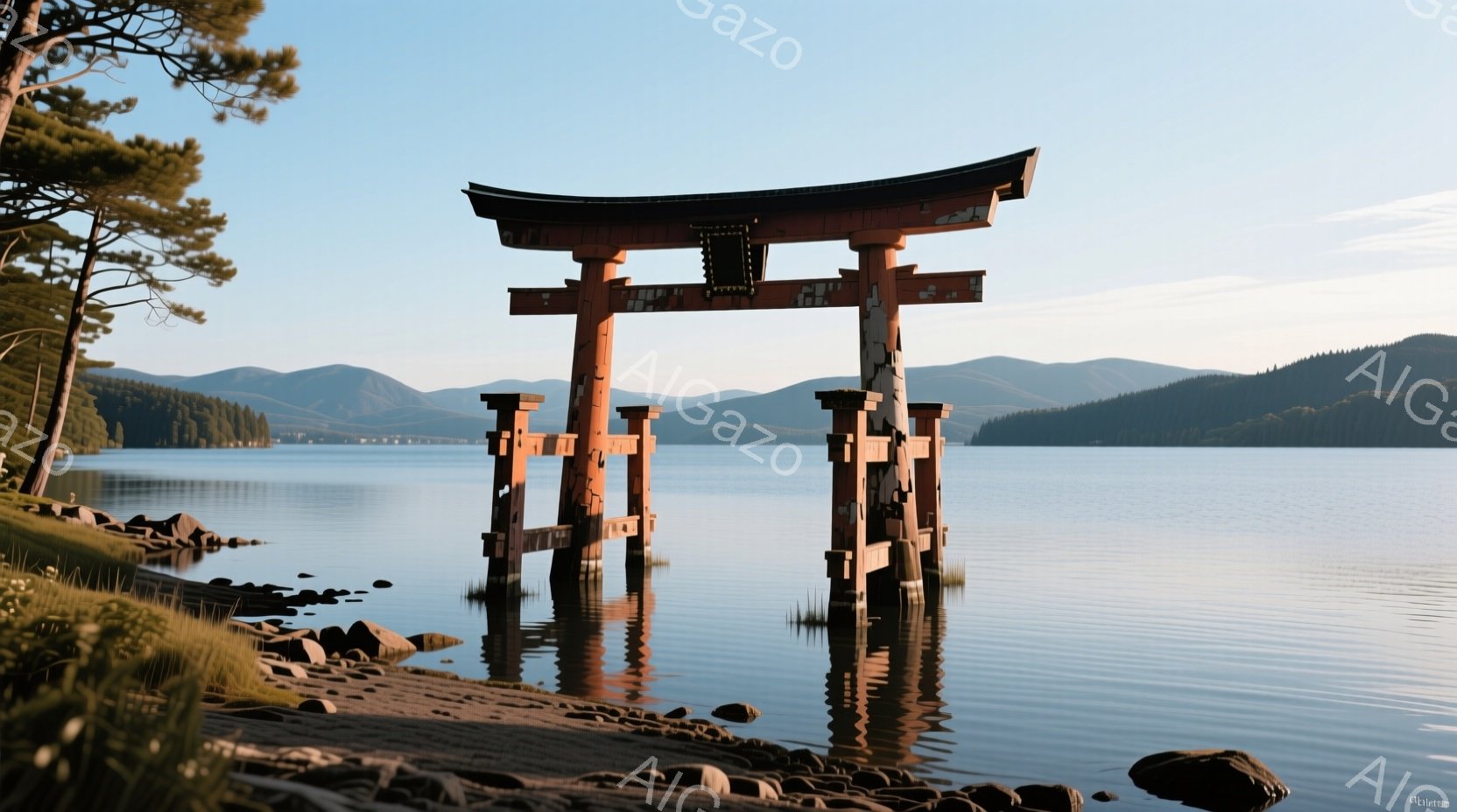 朱色の鳥居が湖の中にそびえ立ち、水面にその姿を映し出している。周囲には緑豊かな山々が連なり、岸辺には岩石が点在し、穏やかな湖水が広がっている。全体的に静寂で神秘的な雰囲気を醸し出しており、自然と文化が調和した美しい風景である。