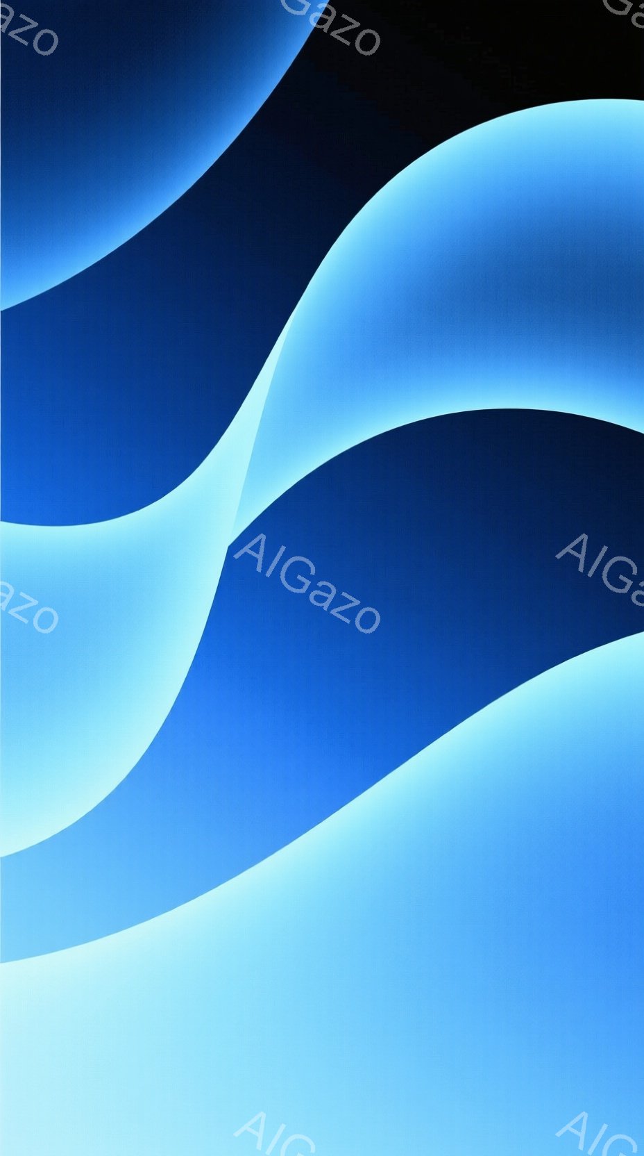 この画像は、青と水色のグラデーションが印象的な抽象的な背景です。曲線が大きくうねり、まるで光が水面を反射しているかのような、流れるような印象を与えます。全体的に冷たく、透明感のある、未来的な雰囲気です。