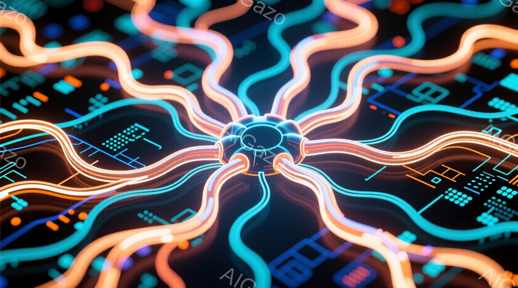 鮮やかなネオンカラーの光線が、暗い背景から放射状に広がっている様子が描かれている。中心部には明るい青色の球体があり、そこからオレンジと水色の光の線が複雑に絡み合い、まるで神経細胞のネットワークのようである。背景には、点在する小さな緑色の正方形が、未来的な雰囲気を醸し出している。