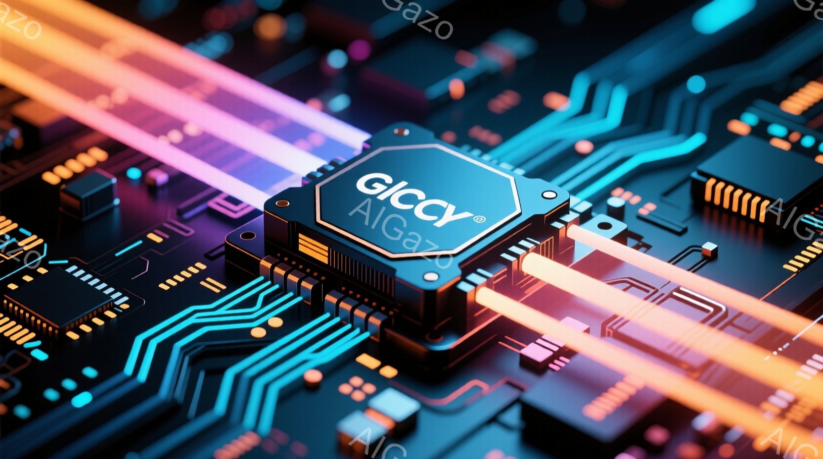 この画像は、複雑な回路基板をクローズアップしたものです。鮮やかなオレンジ色の光ファイバーが基板上を走り、青や赤の電子部品が密集して配置されています。全体的に未来的な雰囲気で、テクノロジーの進化と複雑さを表現しているように見えます。
