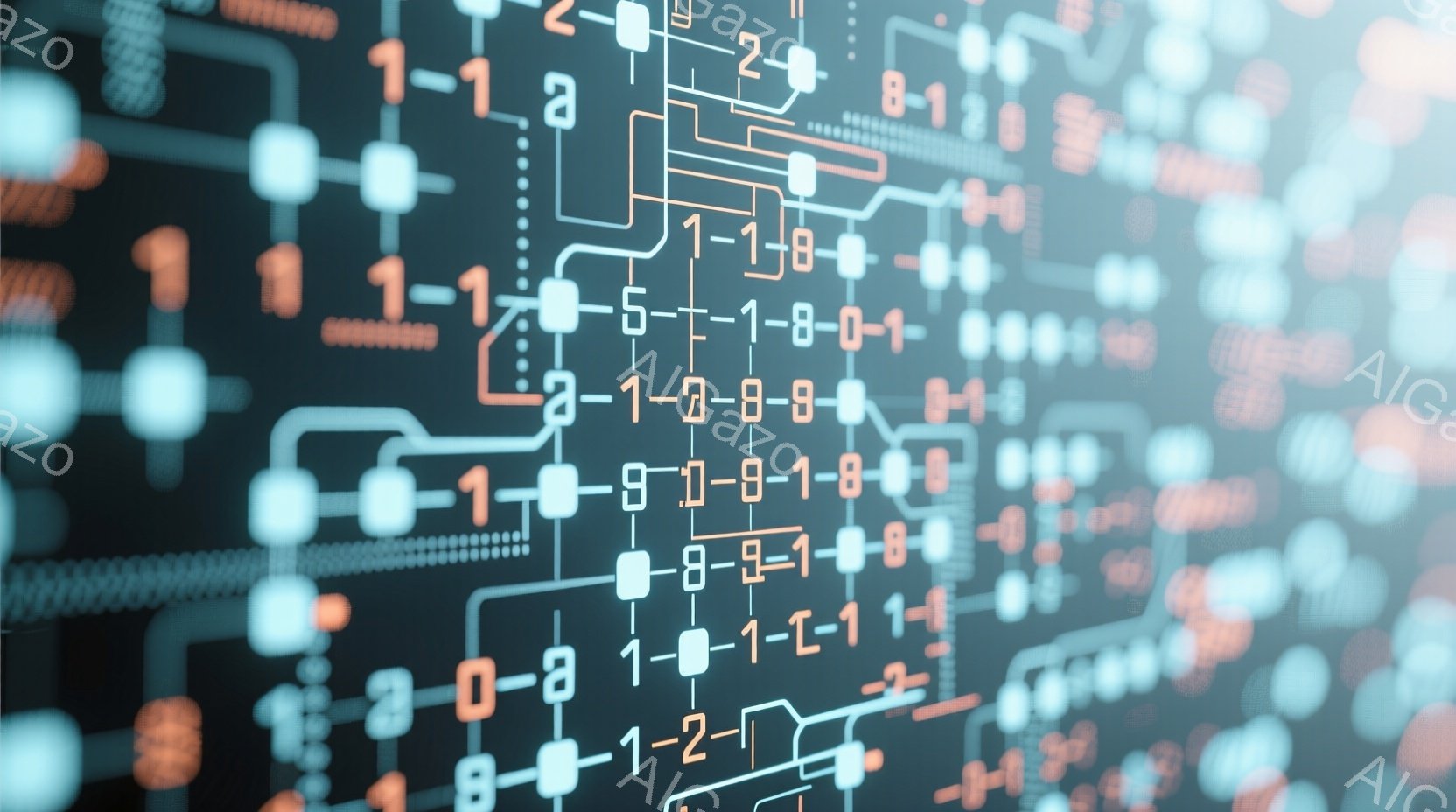 この画像は、青とオレンジ色のデジタル回路が背景全体に広がった抽象的な表現です。数字の「1」や記号「+」などが、回路の一部として繰り返し配置されており、未来的なテクノロジーやデータ処理を想起させます。全体的にぼやけた光の表現が、鮮やかな色彩と相まって、サイバー空間のような雰囲気を作り出しています。
