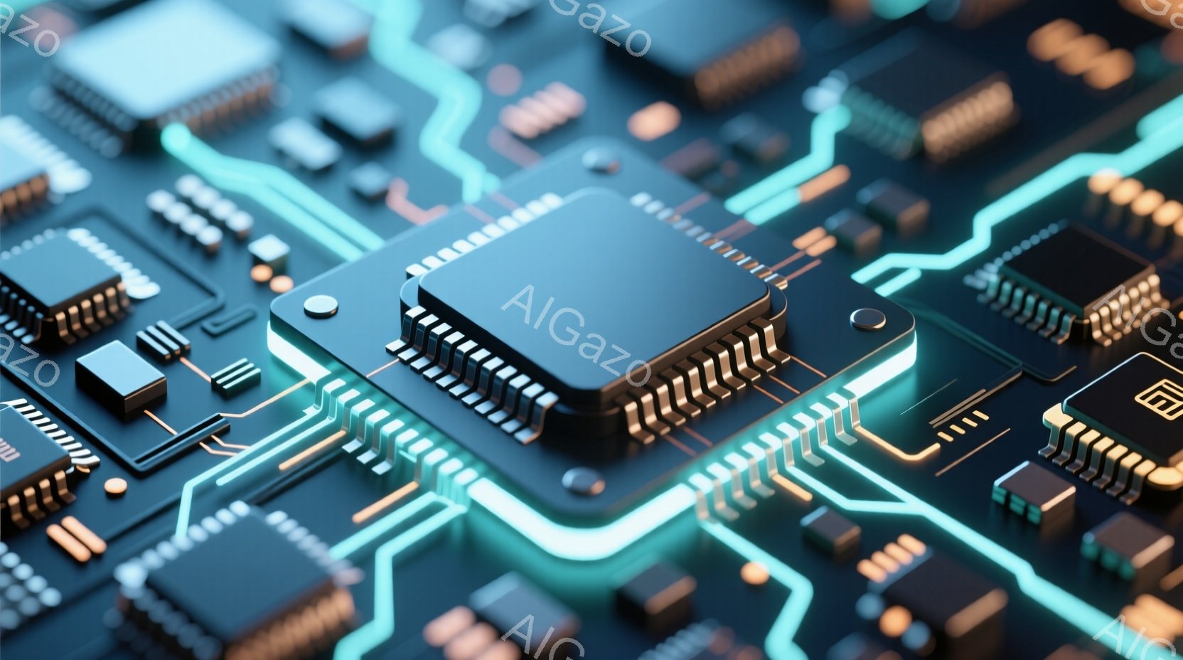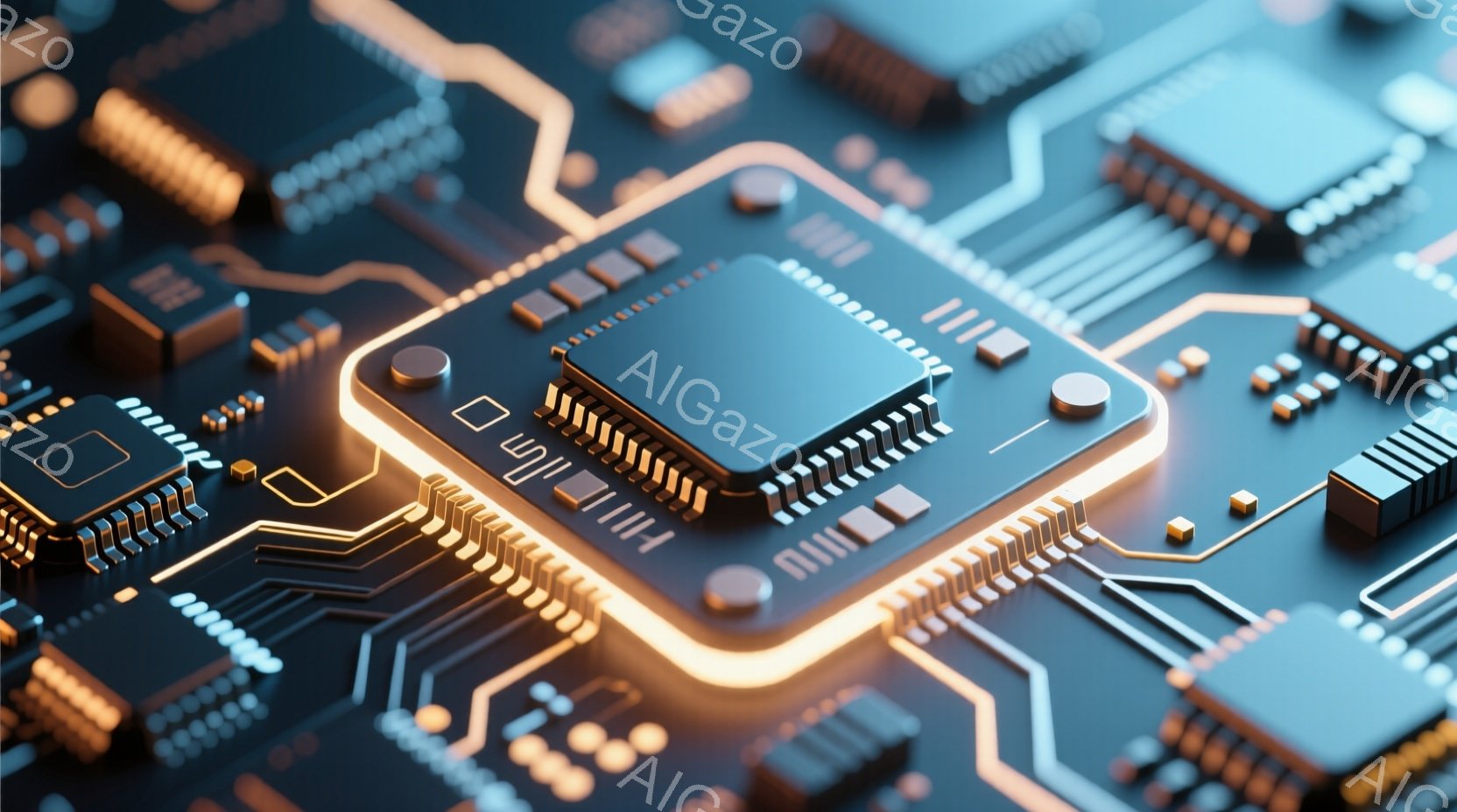 この画像は、回路基板をクローズアップしたもので、金色の光るラインが複雑に走り、未来的な印象を与えます。中央には大きなマイクロチップが配置され、さらに金色に光る枠で強調されています。背景は、同様の回路とチップで埋め尽くされ、高技術で洗練された雰囲気を作り出しています。