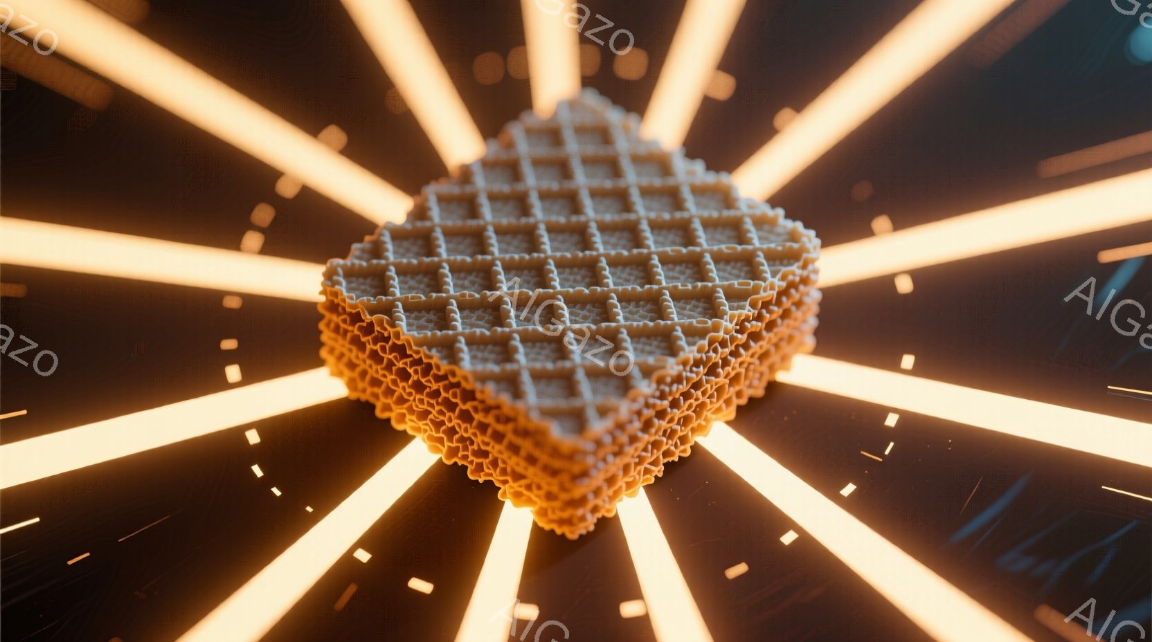 暗い背景に、中央に円形のビスケットのようなものが配置され、そこから放射状に光の線が広がっています。光の線は、小さな球体が連なったような形状をしており、全体的に暖かく幻想的な雰囲気を醸し出しています。この構成は、まるで光の渦巻きや、何かのエネルギーが集中しているかのような印象を与えます。