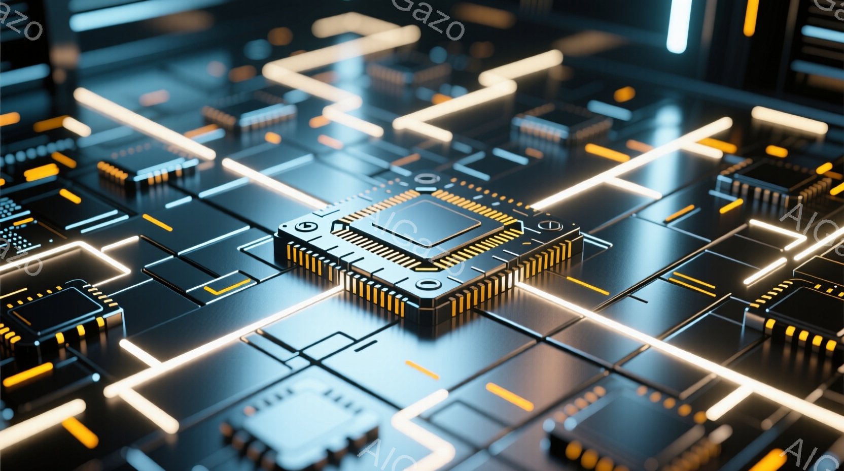 この画像は、複雑な電子回路基板をクローズアップしたもので、様々なチップや配線が幾何学的に配置されています。明るい水色の光が配線を縁取り、チップの金色の接点が鮮やかに映え、未来的な雰囲気を醸し出しています。全体的に、高度なテクノロジーと精密さを表す視覚的な表現となっています。