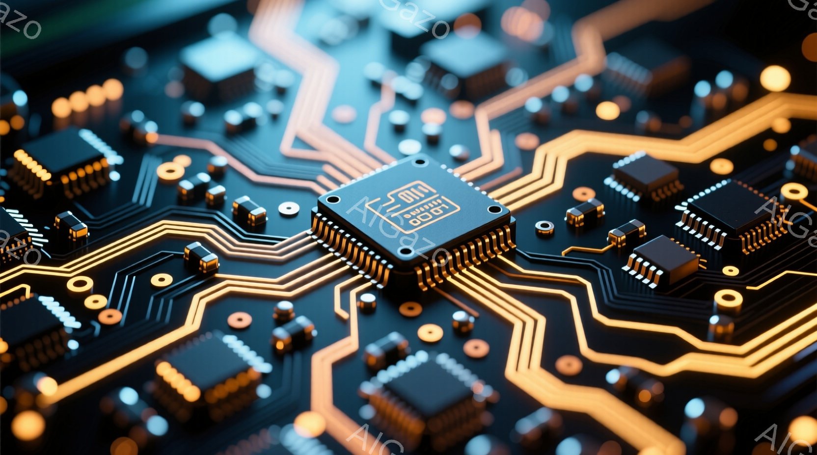 この画像は、複雑な回路基板をクローズアップしたものです。金色の線が黒い基板上を網の目のように走り、様々な電子部品が配置されています。鮮やかな光が回路に反射し、ハイテクで未来的な雰囲気を醸し出しています。