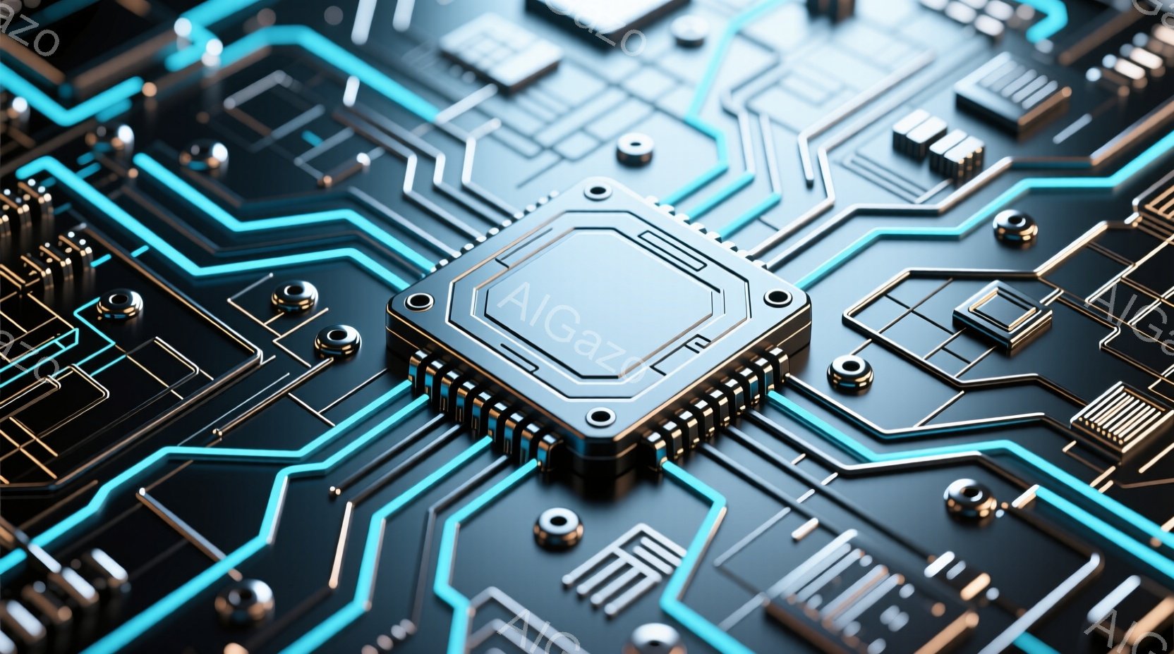 この画像は、複雑な電子回路基板をクローズアップしたものです。青い光が走る配線が黒い基板上を網の目のように走り、中央には銀色のチップが配置されています。未来的なテクノロジーを象徴する、鮮やかで緻密な印象を与える画像です。