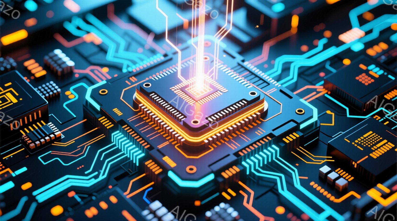 この画像は、複雑な電子回路基板をクローズアップしたもので、金色のラインが鮮やかに輝き、青色の電子部品が配置されています。中央には、発光しているようなCPUが配置され、その周りに細かな配線が網の目のように広がっています。全体的に未来的な雰囲気で、ハイテク技術を象徴するような印象を与えます。