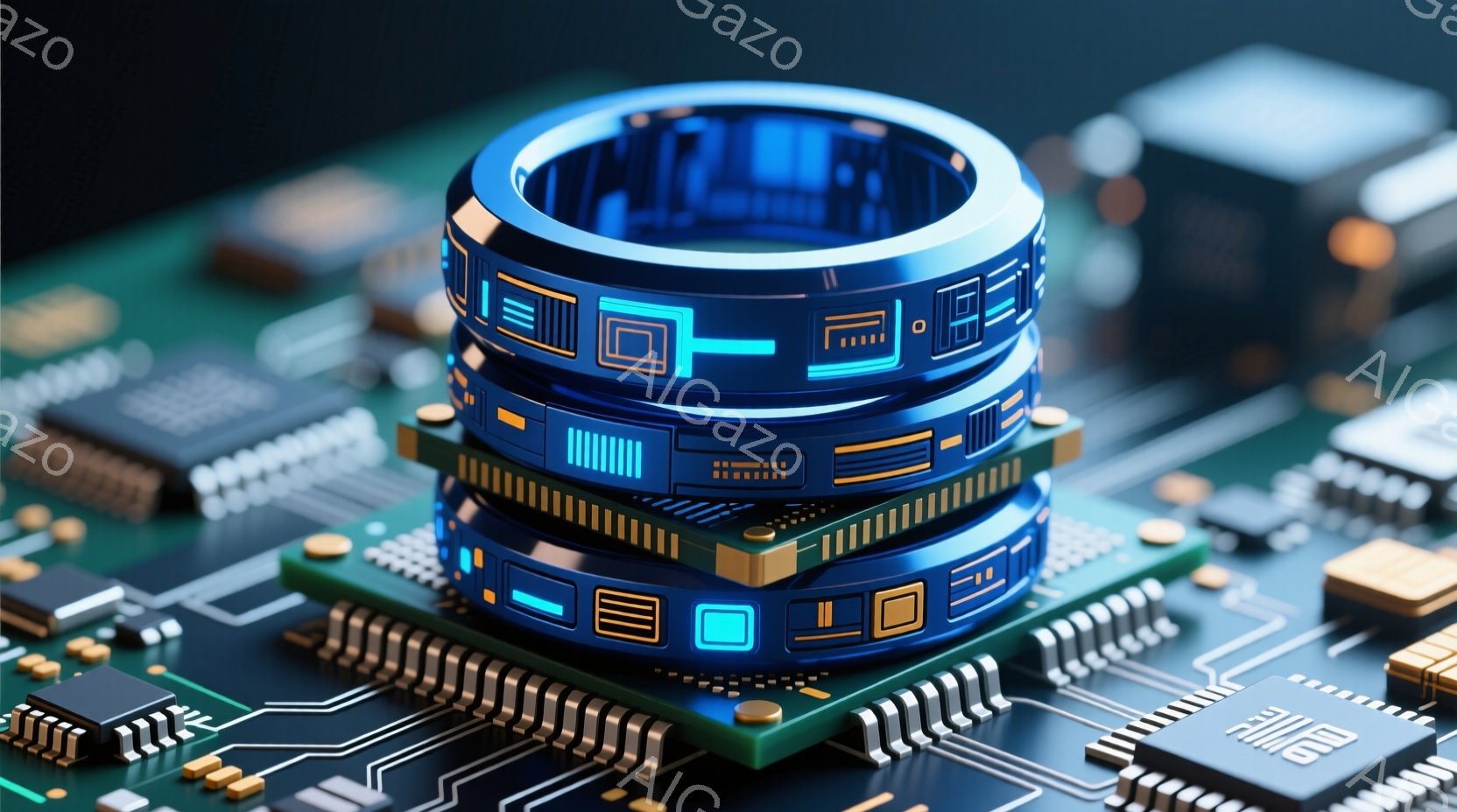 この画像は、複雑な電子回路基板上に配置された未来的なリングを描写しています。リングは青色の光を発し、金色の線で装飾された複数の層で構成されています。基板にはチップや配線が密集しており、高度な技術と未来的な雰囲気を醸し出しています。