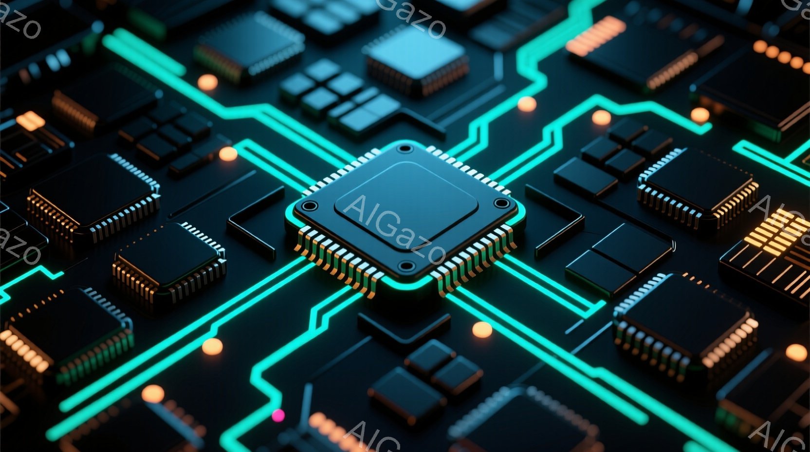 この画像は、暗い背景に配置された電子回路基板のクローズアップです。鮮やかな青色の光る線が回路を形成し、小さな金色のチップが配置されています。全体的に、未来的なテクノロジーの雰囲気があり、精密さと複雑さを強調しています。