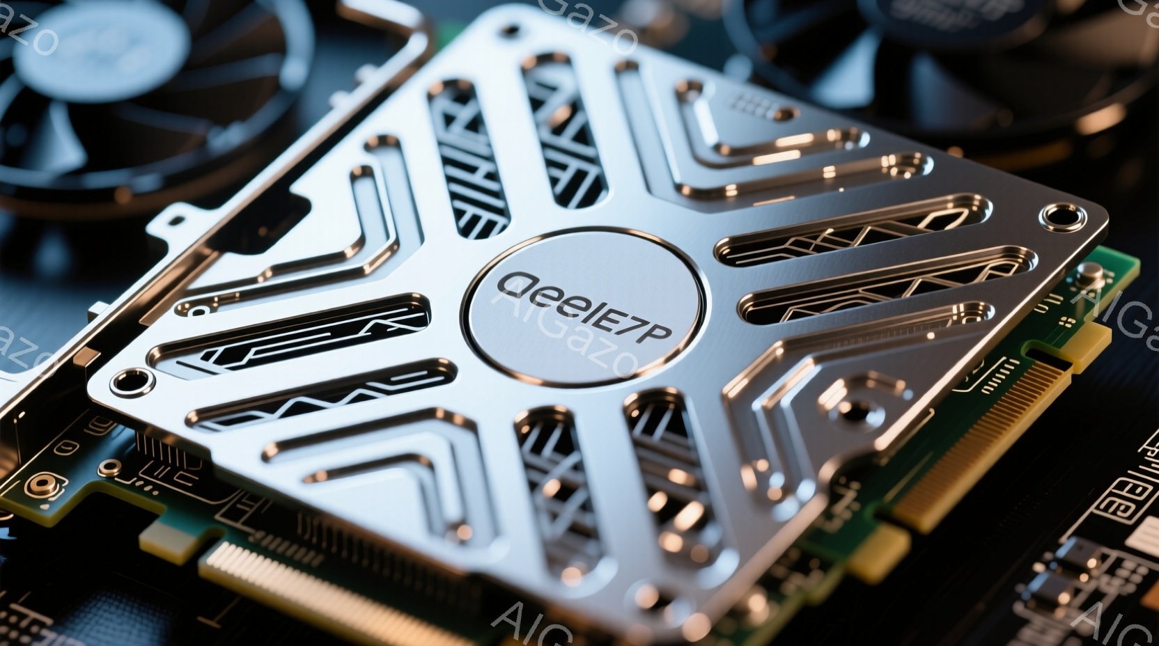 画像は、冷却ファンとヒートシンクを備えた高性能なグラフィックボードの一部を捉えています。金属製の外装は幾何学的なデザインで覆われ、磨き上げられた銀色で輝きを放っています。背景には黒色のテクスチャード加工された表面が見え、技術的な雰囲気を強調しています。