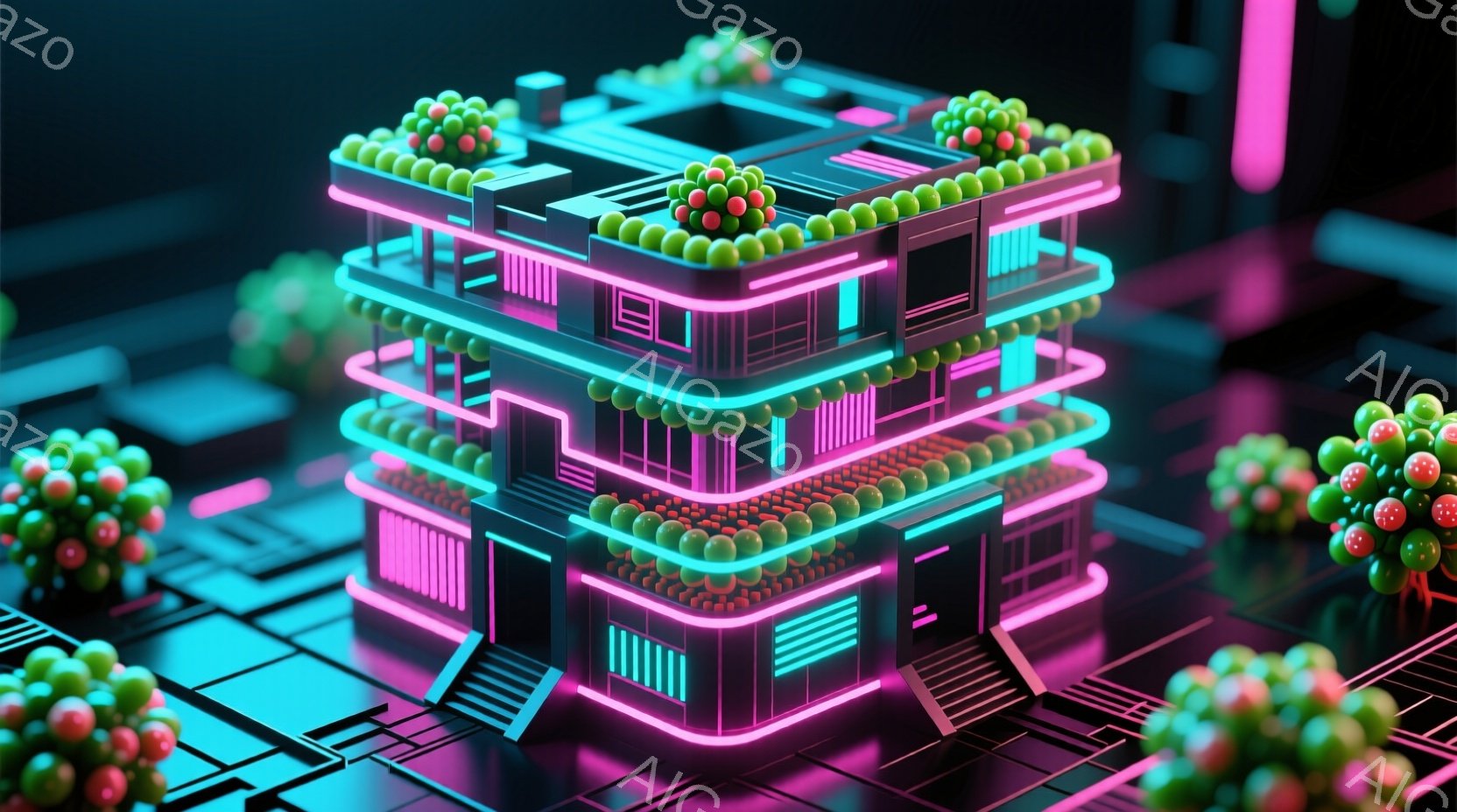 鮮やかなネオンピンクとターコイズブルーで縁取られた、未来的な構造物が画面の中心にあります。幾何学的な形状とミニマルなデザインが特徴で、周囲には緑色の球状のオブジェクトが配置されています。全体的に、サイバーパンク風の、夜の都市を想起させる鮮やかで未来的な雰囲気を醸し出しています。