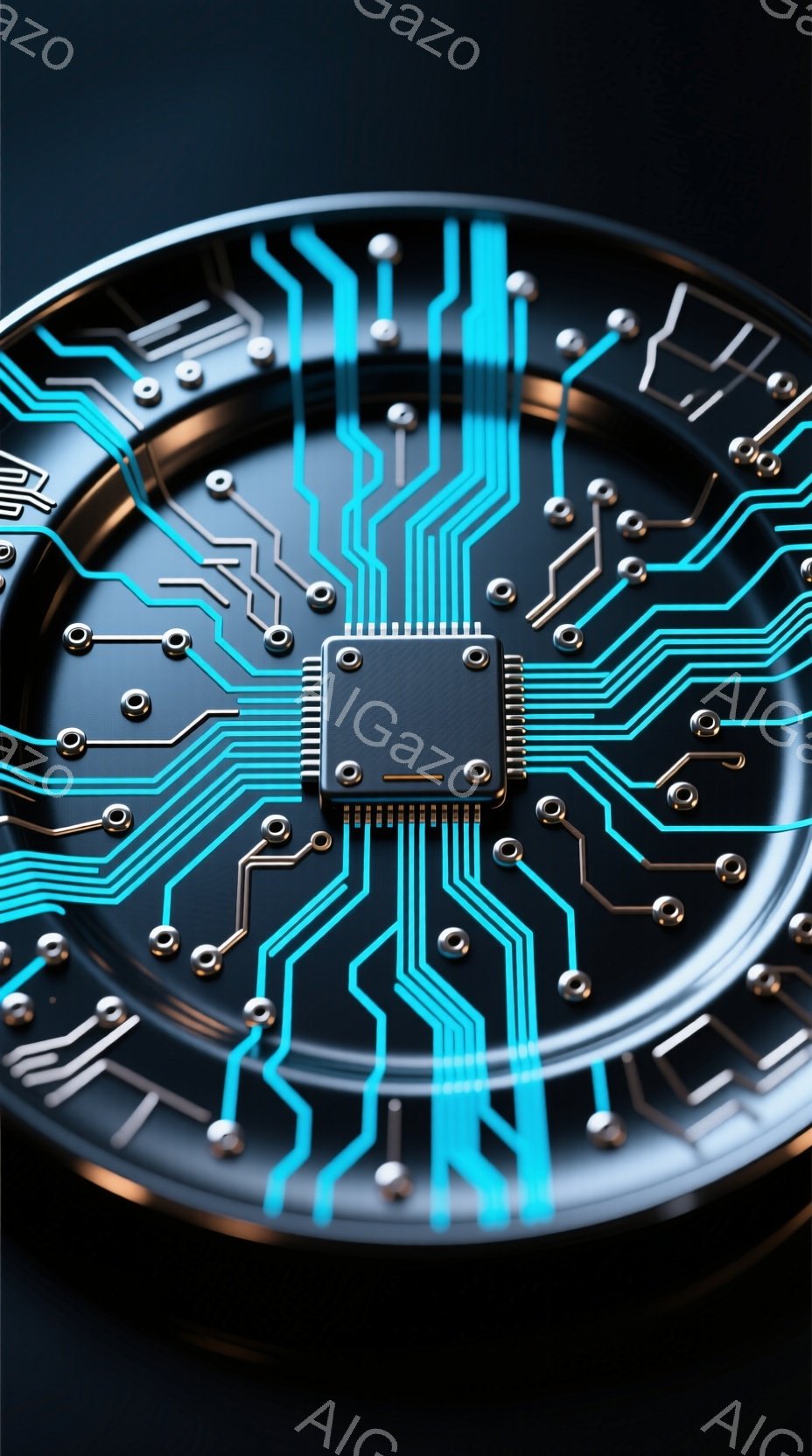 黒い背景に、回路図のようなパターンが青色の線で描かれた円形の物体が写っている。中心部には、より複雑なチップのような回路が配置されており、全体的に未来的な印象を与えるテクノロジー関連のイメージである。青色の光が回路を強調し、精密さと複雑さを表現している。