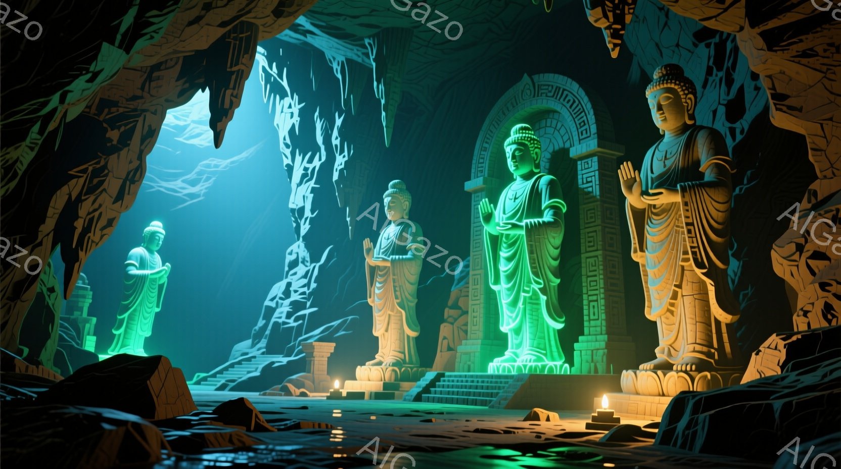 洞窟内に四体の仏像が配置され、中央の仏像は他のものよりやや小さく、青緑色の光に照らされています。仏像はそれぞれローブをまとい、穏やかな表情を浮かべており、静寂と瞑想的な雰囲気を醸し出しています。洞窟の壁面は複雑な模様で覆われ、足元には光るロウソクが置かれ、神秘的で幻想的な空間を作り出しています。
