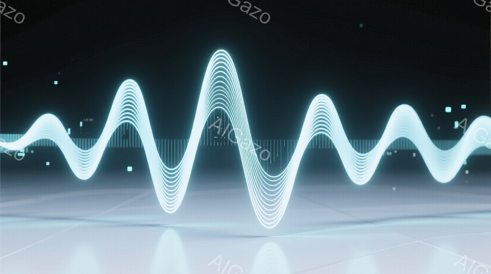鮮やかな水色の波形が、暗い背景に浮かび上がっています。波形は複数の線で構成され、光を放っているように見え、まるで音やエネルギーの流れを視覚化したかのようです。全体的に未来的で、テクノロジーを感じさせる雰囲気です。