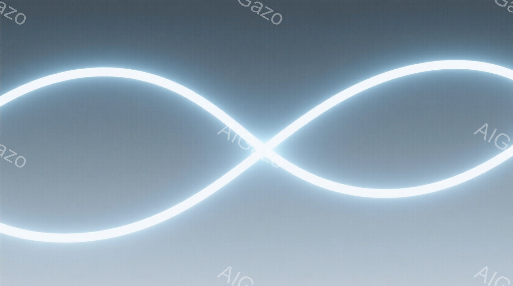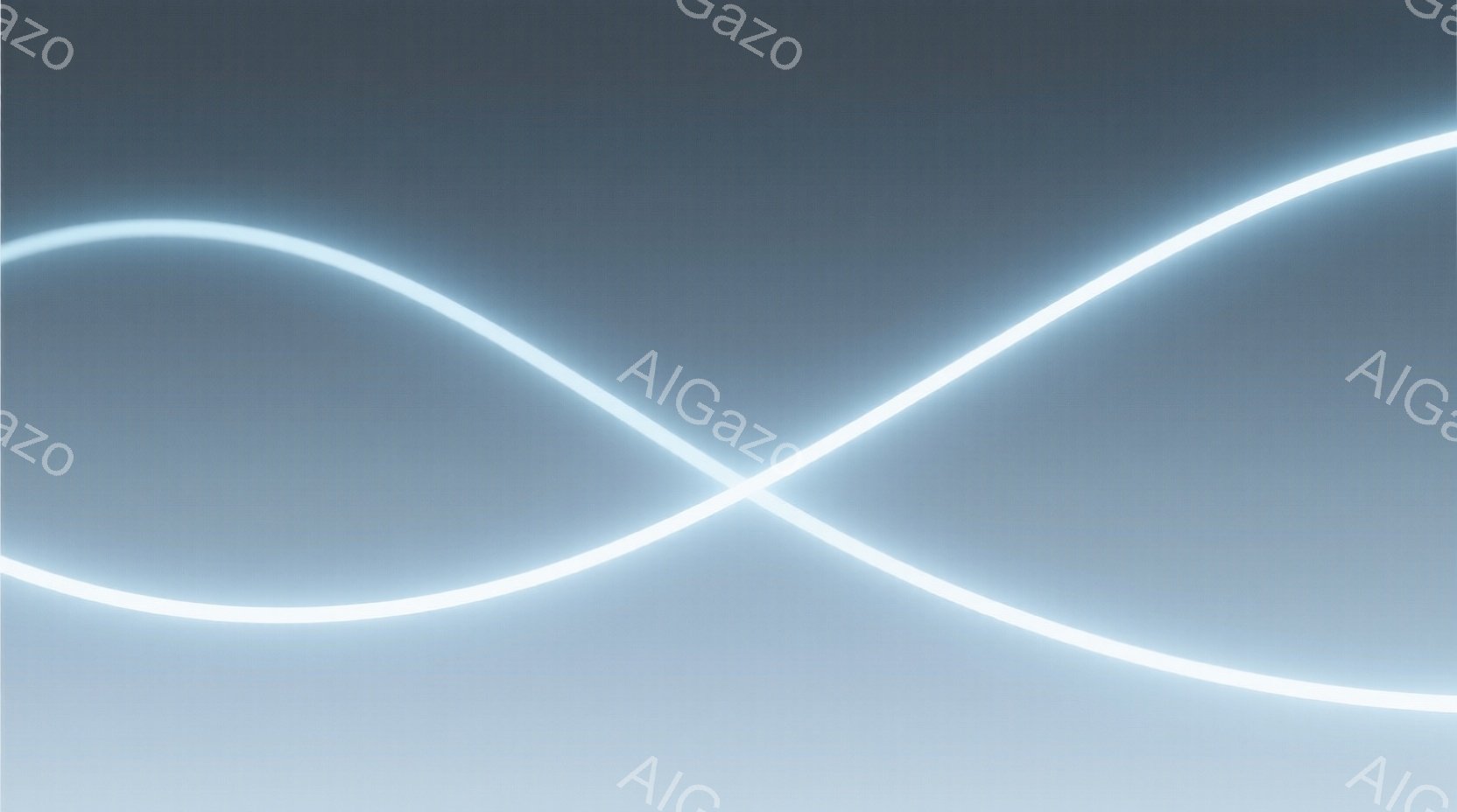 鮮やかな水色の光の線が、暗いグレーのグラデーションの背景の中を曲線的に交差している。光の線は、まるでエネルギーの流れや未来的な回路を連想させるような印象を与える。全体として、静かで神秘的な雰囲気を持ち、SF映画やデジタルアートの世界観を彷彿とさせる。