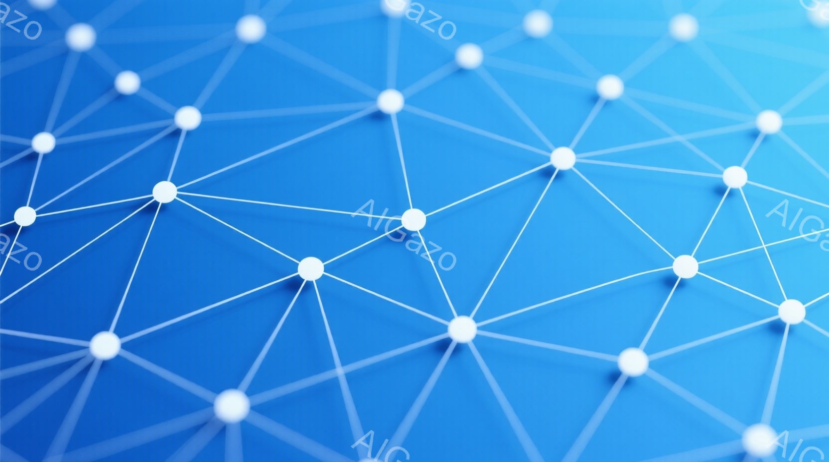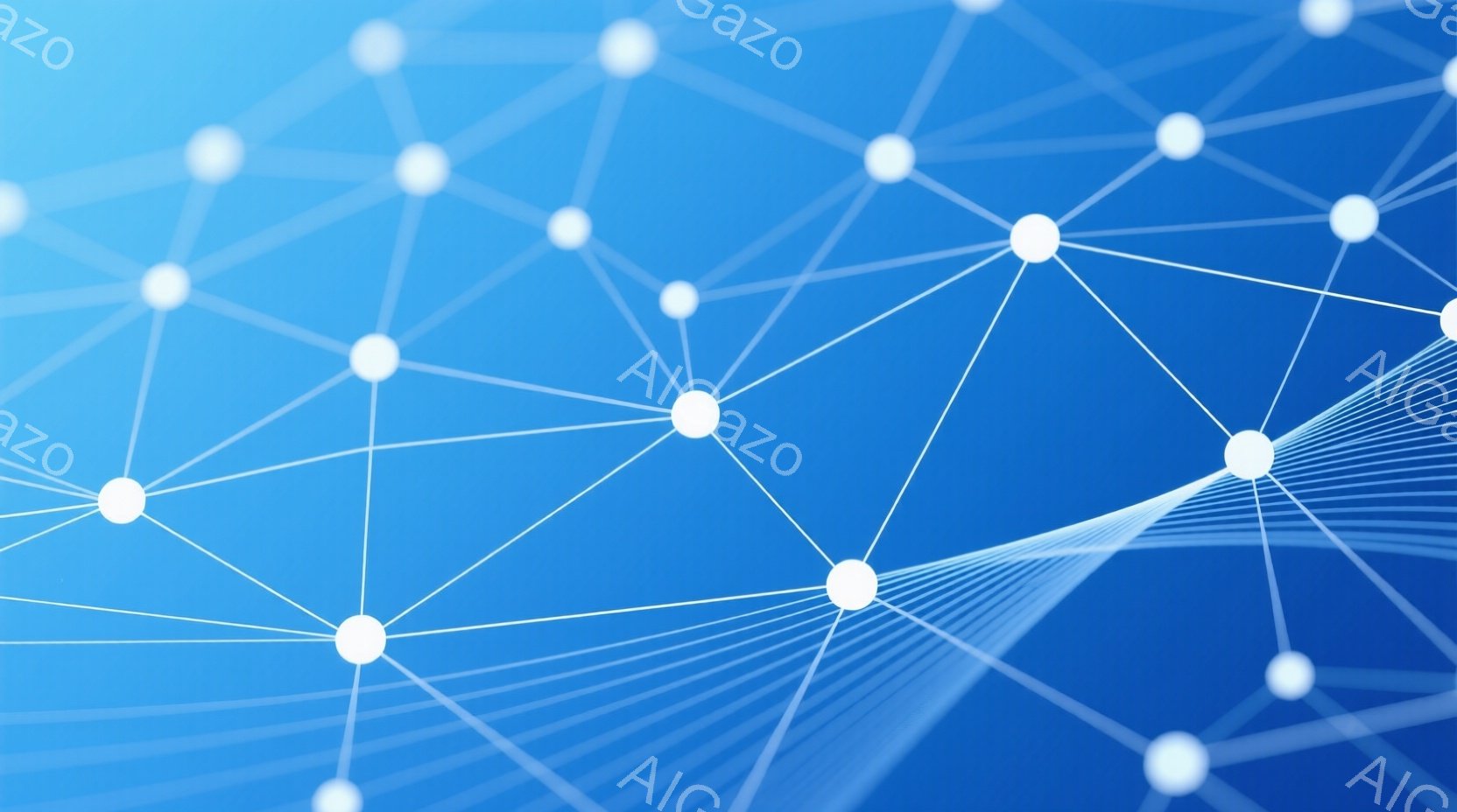 この画像は、青色のグラデーションを背景に、白い点が線で結ばれたネットワーク状のパターンが広がっています。線は点と点を繋ぎ、複雑な繋がりを視覚的に表現しており、抽象的で未来的な印象を与えます。全体的に、デジタルな繋がりや情報ネットワークを連想させる、洗練されたデザインです。
